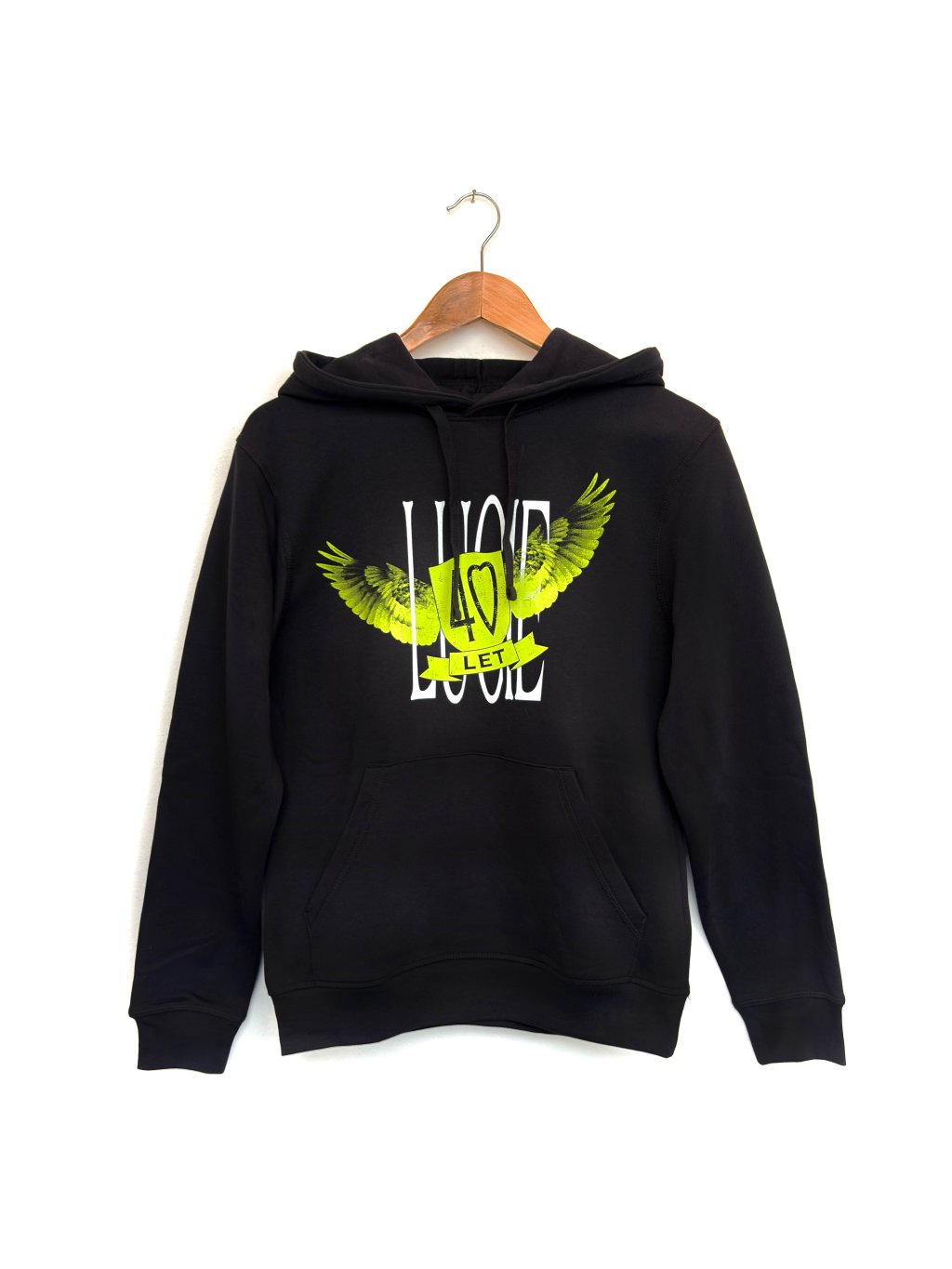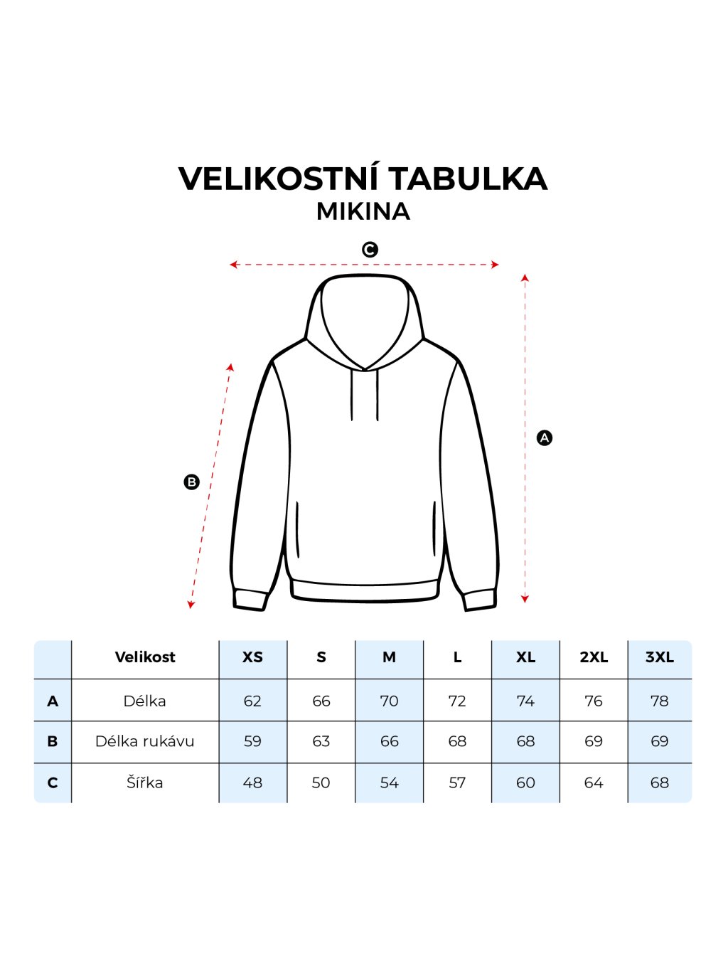 Mikina s kapucí s plochými stahovacími šňůrkami a s kapsou ve stylu klokanky. Vnitřní zpevňující páska na zádech. Spodní lem a lemy rukávů s žebrováním 1:1. Ploché prošití všech švů.